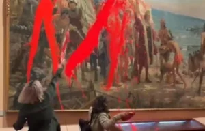 Dos activistas del colectivo Futuro Vegetal han protagonizado este sábado un nuevo acto de protesta en Madrid, arrojando pintura roja biodegradable sobre el cuadro Primer homenaje a Cristóbal Colón, de José Garnelo, expuesto en el Museo Naval. La acción, realizada coincidiendo con la celebración del Día de la Hispanidad, pretendía … Sigue leyendo VÍDEO | Activistas vandalizan un cuadro de Colón en el Museo Naval durante el 12 de octubre
