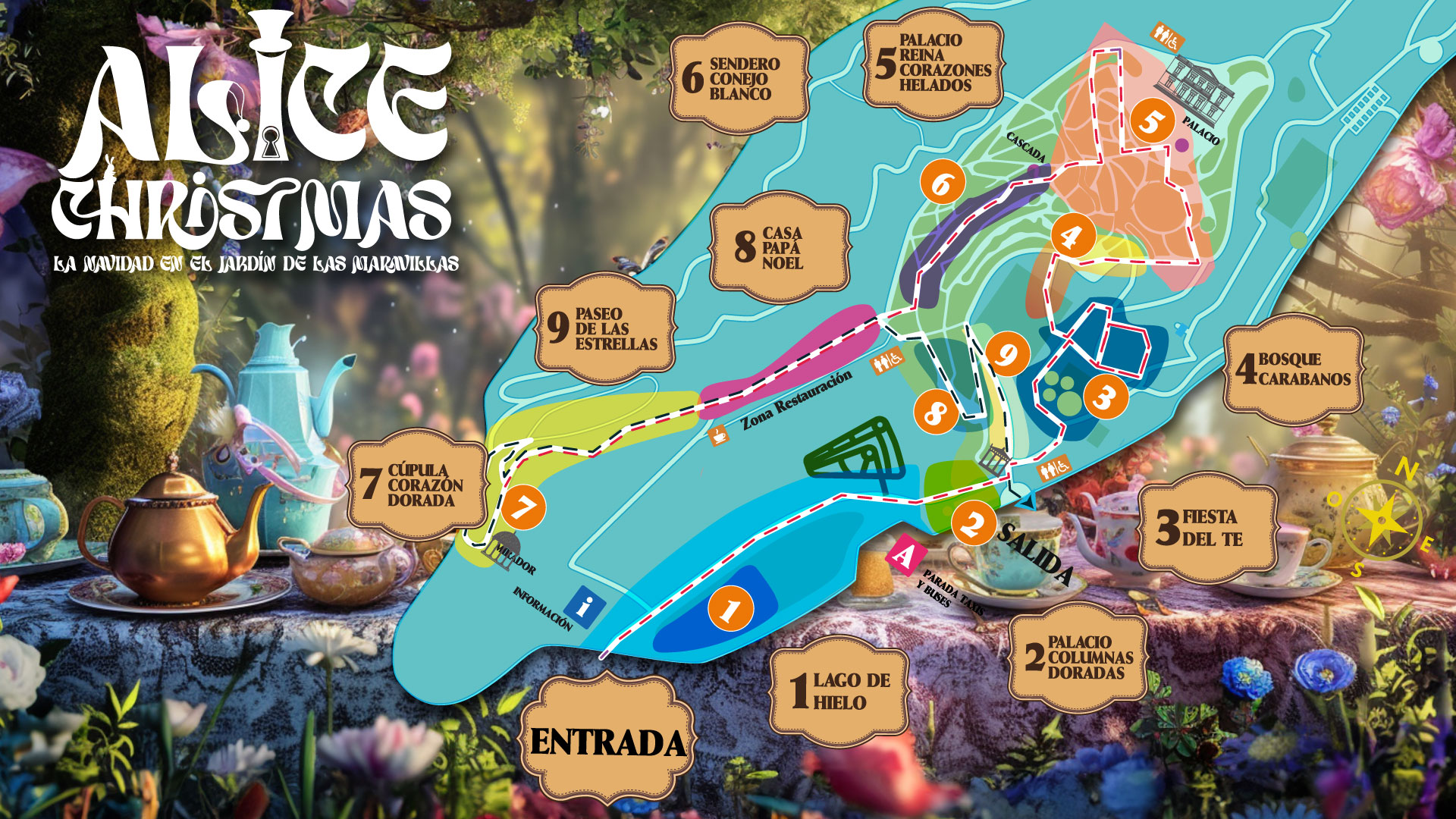 La propuesta invita a redescubrir el jardín malagueño a través de nueve mundos temáticos donde los visitantes caminarán junto a personajes como Alicia, el Sombrerero Loco, el Conejo Blanco o la Reina de Corazones Congelados. Cada espacio del itinerario —desde el Lago de Hielo hasta la Cúpula del Corazón Dorado— ha sido diseñado para envolver al público en una experiencia sensorial que combina arte, literatura y naturaleza.