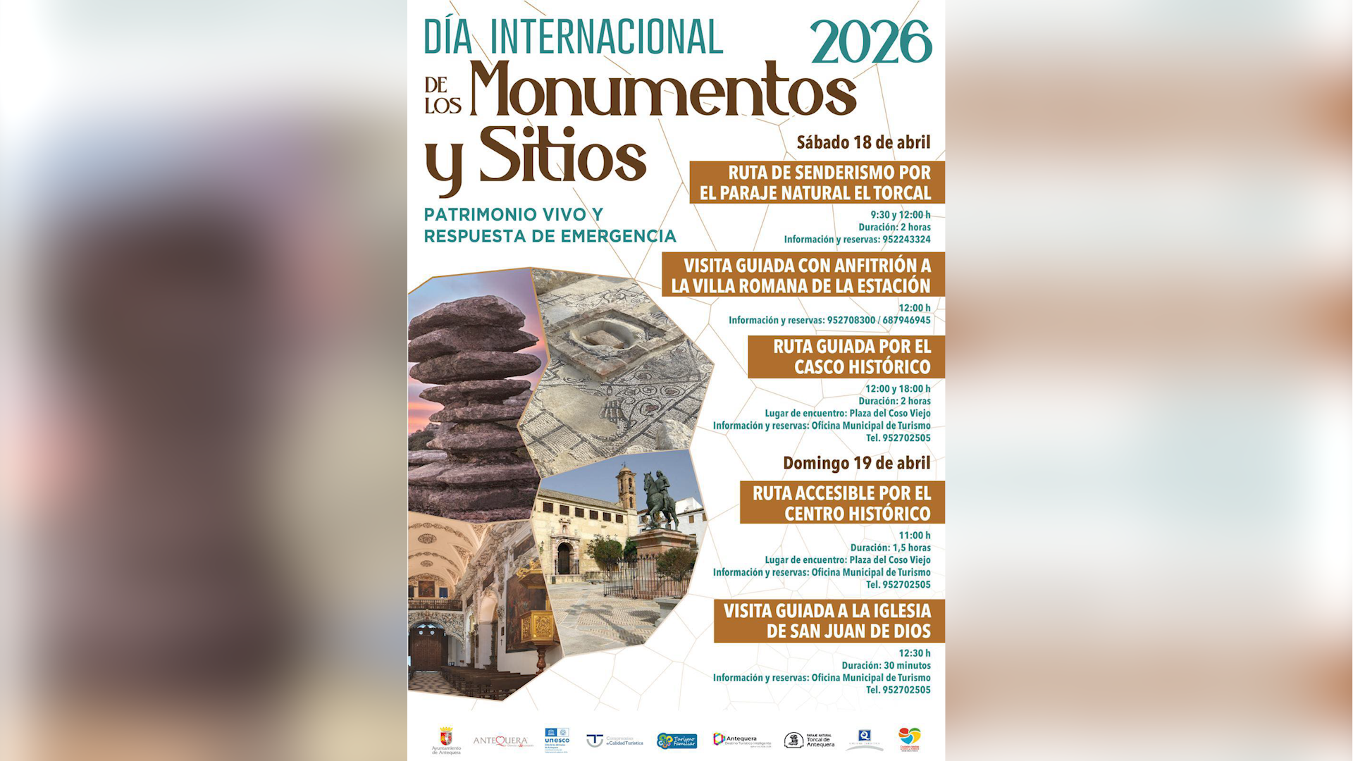 La ciudad de Antequera se prepara para conmemorar el Día Internacional de los Monumentos y Sitios 2026 con un amplio programa de actividades que se desarrollará durante este fin de semana, sábado 18 y domingo 19 de abril, bajo el lema «Patrimonio Vivo y Respuesta de Emergencia».
