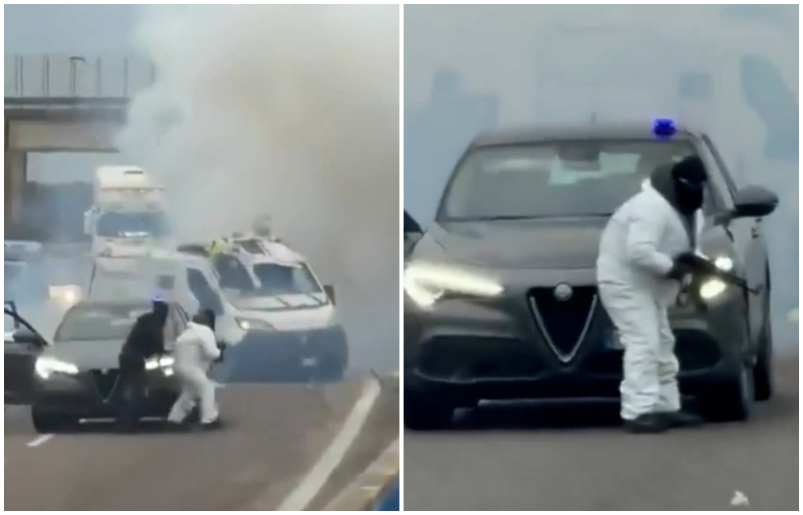 Tras ello, los delincuentes interceptaron dos furgones blindados que circulaban juntos por la vía, haciéndose pasar por agentes con vehículos policiales, equipados con luces azules intermitentes. Una vez que los furgones se detuvieron, varios individuos bajaron de los vehículos, vestidos de negro y armados con metralletas.
