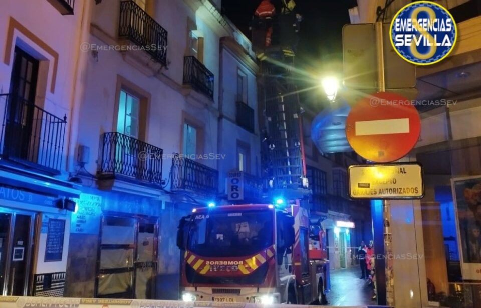 Los Bomberos y la Policía Local han intervenido en la calle Murillo tras el desprendimiento de varios trozos de una cornisa de un edificio, lo que ha provocado la corte de la vía al tráfico durante la actuación.