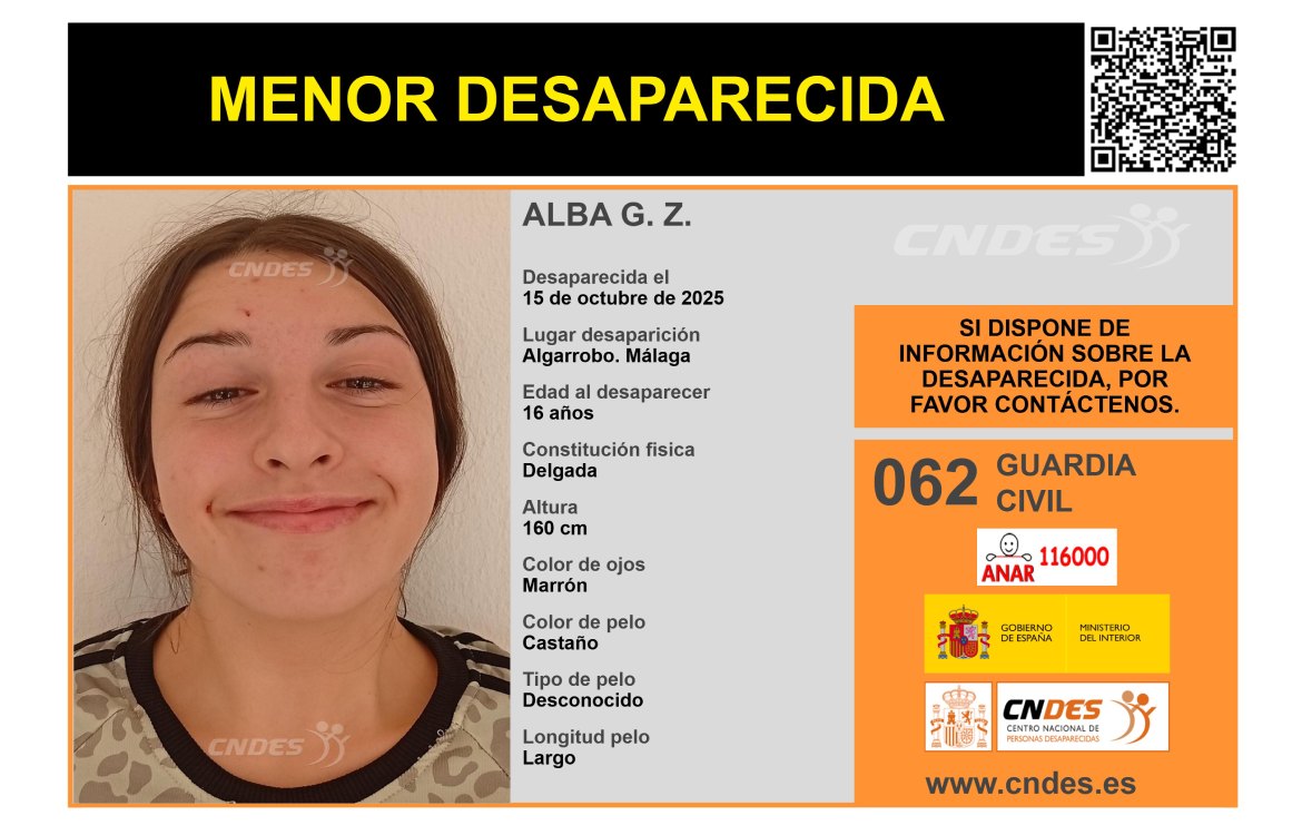 Su nombre es Alba G.Z., tiene 16 años, y lleva desaparecida desde el pasado 15 de octubre, cinco días. Según informan desde el Centro Nacional de Personas Desaparecidas, su constitución física es delgada, mide 1,60 metros, tiene los ojos marrones y el pelo largo y castaño.