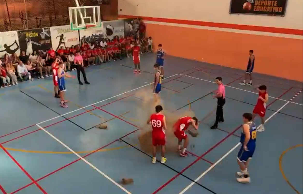 Cae un panel del techo sobre la cabeza de un jugador de baloncesto en los Salesianos de la Trinidad
