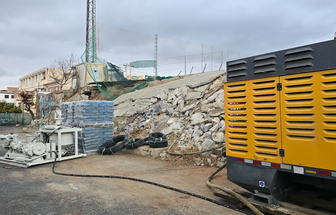 El Ayuntamiento de Huétor Vega informa de que la empresa encargada de la reconstrucción y refuerzo del muro perimetral del polideportivo municipal Las Viñas ya se encuentra trabajando sobre el terreno.