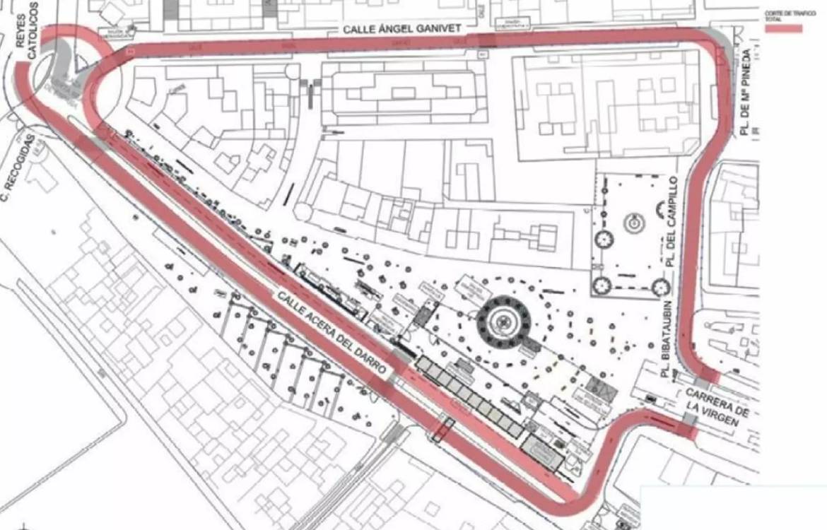 La Plaza Marina Pineda tendrá cortes en el lateral más próximo a Ángel Ganivet. Los vehículos ligeros podrán acceder a San Matías. Los vehículos pesados circularán por Reyes Católicos.