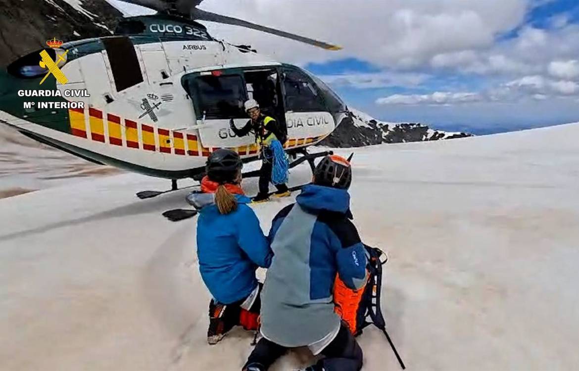 No pasó mucho tiempo hasta que el instituto armado recibió otra alerta del servicio de Emergencias 112. Fue a las 11.40 horas, cuando una pareja de alpinistas, un hombre de 55 años y una mujer de 49, se había quedado bloqueada en el canuto del Veleta, en Monachil, una ubicación especialmente inestable por el riesgo de desprendimiento tanto de rocas como de hielo. De nuevo fueron movilizados efectivos del Greim y la Unidad Aérea, que encontraron una situación de nieve que obstaculizaba su actuación y tuvieron que realizar un complejo apoyo parcial del helicóptero.