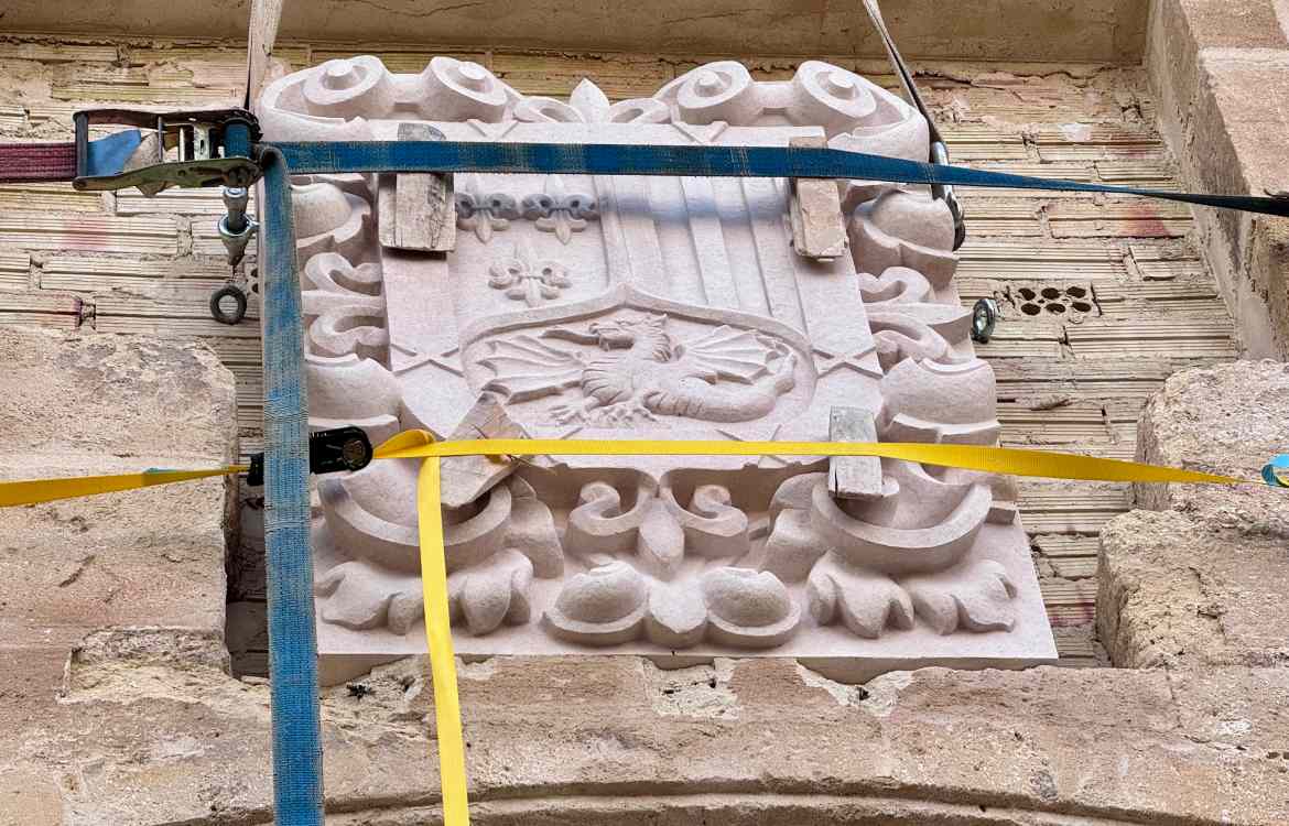 El escudo, que muestra la heráldica eclesiástica y nobiliaria propia del Cardenal de la Cueva —incluyendo sus característicos nudos y atributos—, vuelve a coronar la entrada principal del templo tras un meticuloso proceso de restauración.