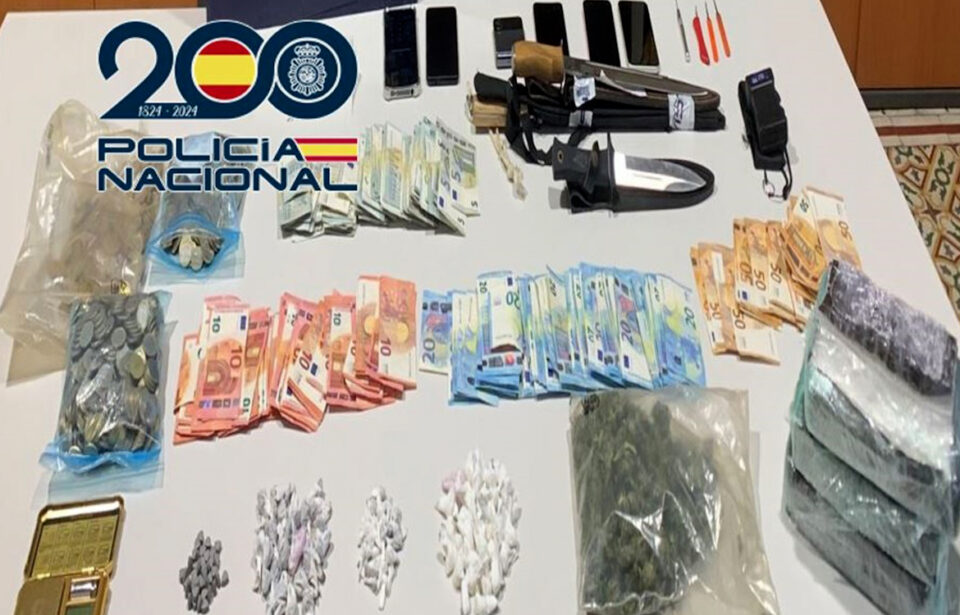 Durante los registros, los investigadores localizaron un total de 57 dosis de cocaína, 41 dosis de heroína, 41 pastillas de MDMA, 110 gramos de cogollos de marihuana y 3 kilogramos de producto destinado a adulterar droga. Asimismo, se incautaron más de 4.700 euros en metálico y tres machetes de grandes dimensiones, además de diversos objetos asociados a la actividad de distribución de estupefacientes.