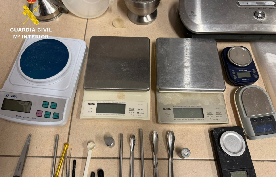 La Guardia Civil procedió al registro del domicilio tras las primeras pesquisas y datos obtenidos. En su interior fueron intervenidos 1.820 gramos de sustancias sintéticas tales como anfetaminas, MDMA y Ketamina, valoradas en 86.000 euros en su conjunto. Durante el registro, el equipo incautó cuatro básculas de precisión y material específico que se empleaban para el equipamiento, preparación, conservación y envío de las sustancias. Además se encontró material informático para la utilización de las plataformas.
