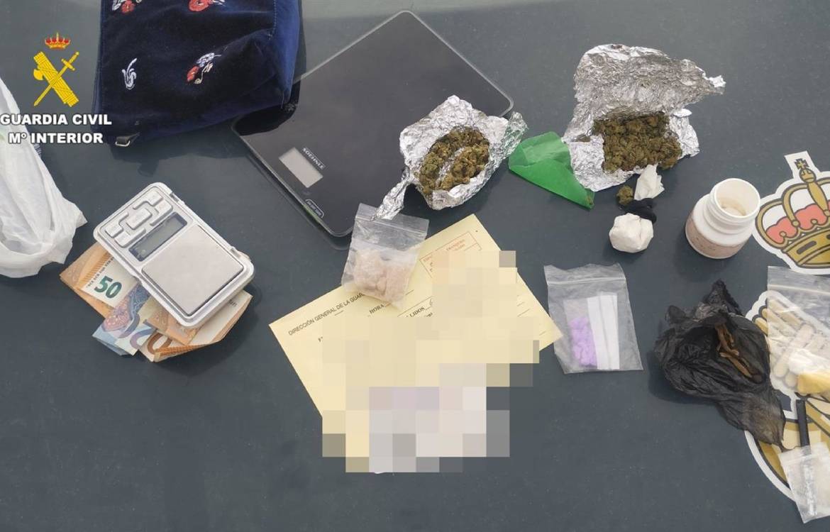 En concreto seis gramos de cogollos de marihuana, dos bolsitas con un peso total de unos siete gramos de cocaína, un bote con 114 pastillas de colores, un pañuelo con otras tres pastillas, una bolsita con aproximadamente diez gramos de cristal y otra bolsita con unos dos gramos de hongos alucinógenos; además de un peso de cocina, una báscula de precisión y dinero en billetes de diverso valor.