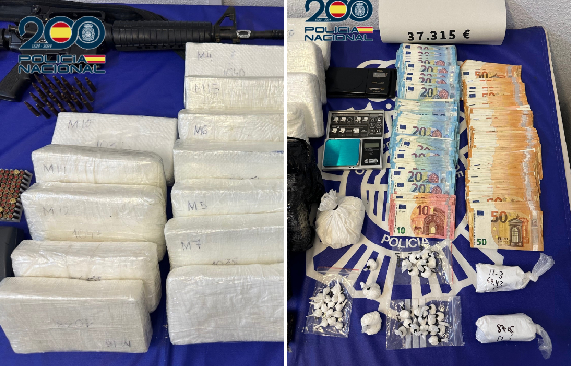En total se practicaron cuatro registros en Málaga capital. En ellos se intervinieron 20 kilos de cocaína, 128 gramos de hachís, diversos fármacos, más de 37.000 euros en efectivo, cuatro vehículos y varias armas, entre ellas un fusil, una pistola simulada, un arma blanca prohibida y munición.