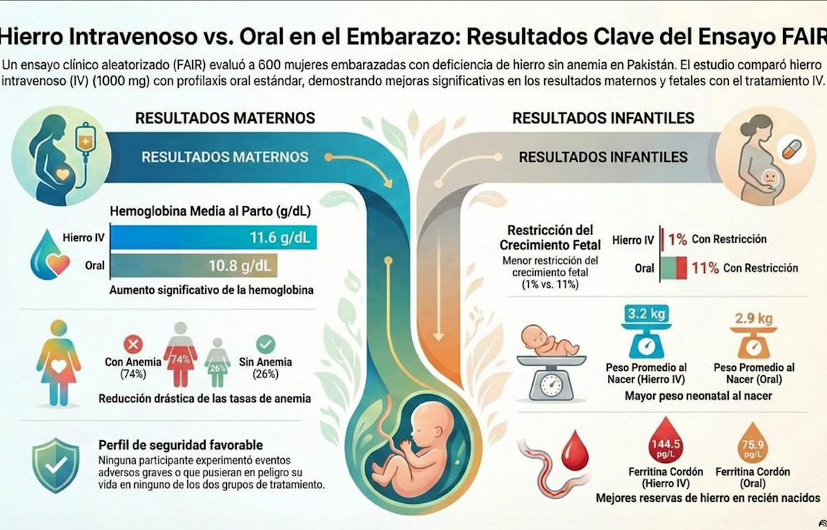 Esto pone de manifiesto la importancia de abordar de forma precoz la deficiencia de hierro no anémica durante el embarazo, una condición frecuentemente infradiagnosticada que puede tener consecuencias significativas tanto para la madre como para el feto.
