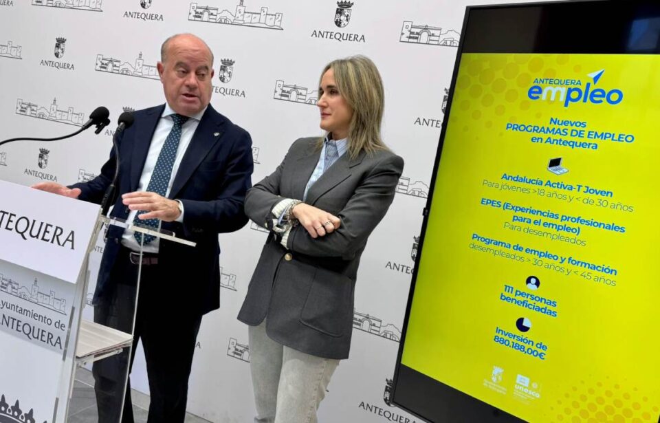 El alcalde de Antequera, Manolo Barón, junto a la edil responsable de Promoción para el Empleo, Paqui Sánchez, han presentado en rueda de prensa una nueva iniciativa municipal orientada a fomentar el empleo y la formación, compuesta por tres programas que beneficiarán a un total de 111 personas desempleadas del municipio.
