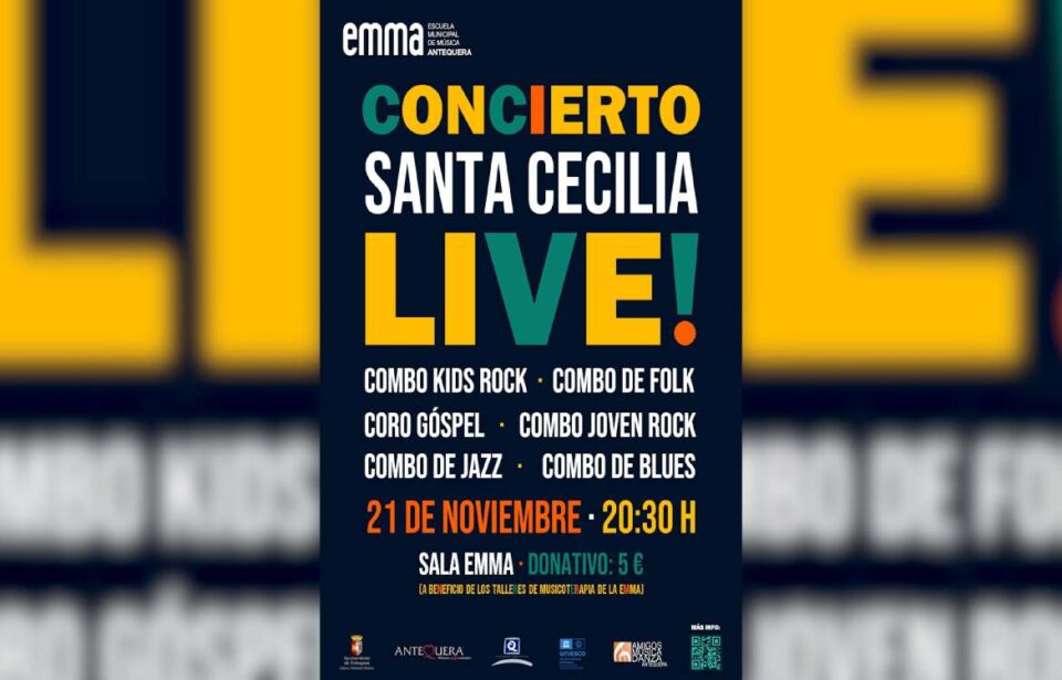 La Escuela Municipal de Música de Antequera (EMMA) celebra el próximo 21 de noviembre a las 20:30h el concierto Santa Cecilia LIVE! en la Sala EMMA, con motivo del Día de Santa Cecilia, patrona de la música.