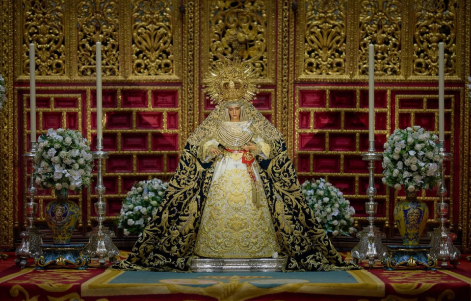 La Virgen de la Esperanza estrena una saya bordada en oro fino sobre tejido igualmente bordado en plata y recamado en lentejuelas. La prenda ha sido realizada en el taller de Manuel Solano, con diseño de Gonzalo Navarro, siguiendo la idea original de Ignacio Sánchez Rico.