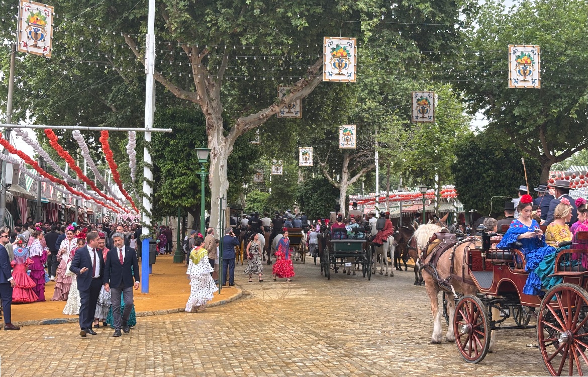 El ambiente se deja notar especialmente a partir del mediodía, cuando las calles comienzan a llenarse de trajes de flamenca, chaquetas cortas y grupos que buscan disfrutar de una de las jornadas más tradicionales de la semana. Los paseos de caballos y carruajes vuelven a convertirse en uno de los grandes atractivos durante la tarde, dibujando estampas típicas que cada año marcan el ritmo de la feria.