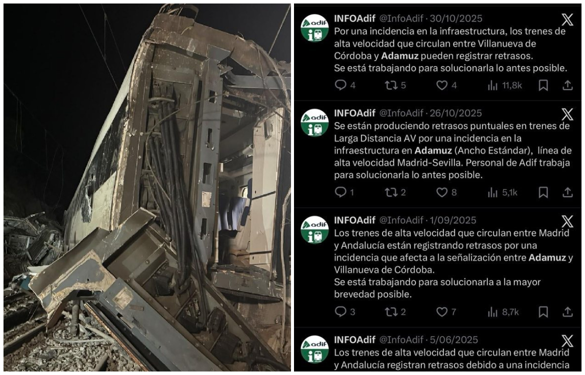 La cuenta que notifica habitualmente las incidencias ferroviarias es @Infoadif. Se trata de la plataforma en redes sociales del Administrador de Infraestructuras Ferroviarias para dar cuenta de cuántos percances o situaciones se producen en las vías. Así, desde la noche de este domingo muchos usuarios de redes sociales vienen contabilizando las numerosas veces que el nombre del municipio cordobés de Adamuz había salido en estas incidencias en los meses previos y en los últimos años.