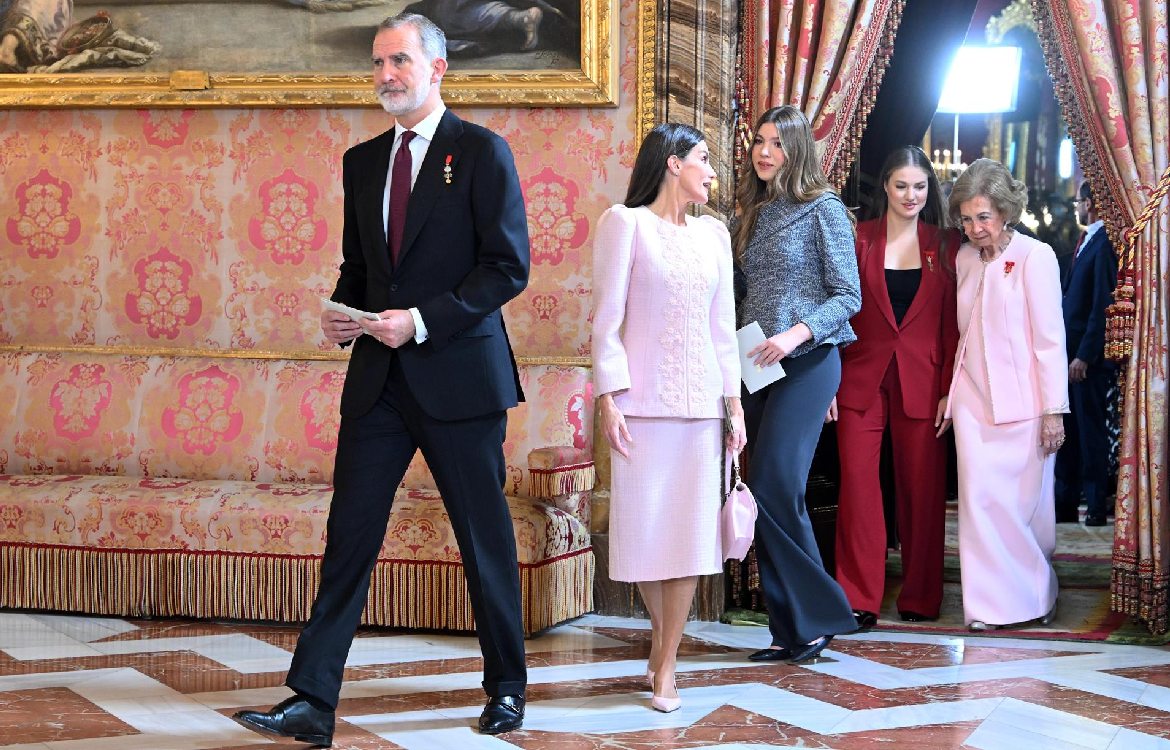 La Reina ha recibido de manos de su hijo la insignia de esta distinción, con gesto sonriente, tras lo cual ha recibido un caluroso aplauso de los asistentes, entre los que estaban el presidente del Gobierno, Pedro Sánchez, el líder de la oposición, Alberto Núñez Feijóo, así como la práctica totalidad de los presidentes autonómicos.