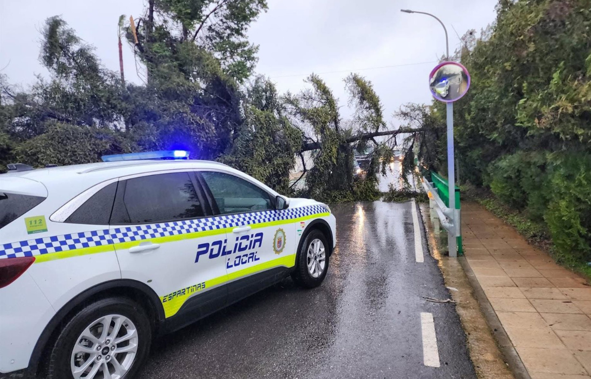 Los operarios del consistorio están trabajando en la zona para quitar el árbol lo antes posible. También se ha dado aviso a la Red de Carreteras de la Junta de Andalucía. Desde la Policía Local se pide extremar la precaución como consecuencia de las fuertes rachas de viento que trae esta nueva borrasca y las intensas lluvias, que ha motivado que esté activo el aviso naranja de la Aemet hasta las 15.00 horas.