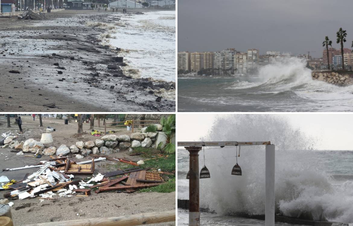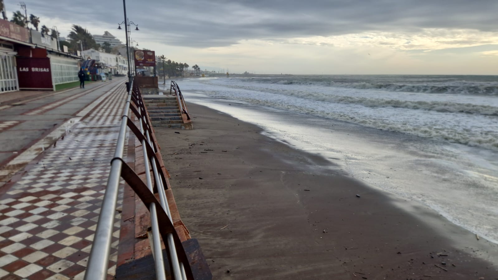 La playa de Benalmádena registró los peores daños de la Costa del Sol. El oleaje arrasó completamente un quiosco de enseres náuticos y afectó a varias pasarelas de madera. La Policía Local y los Bomberos acordonaron la zona para evitar accesos al área afectada. En el resto de playas, el viento provocó pérdida generalizada de arena sin más incidencias reseñables.