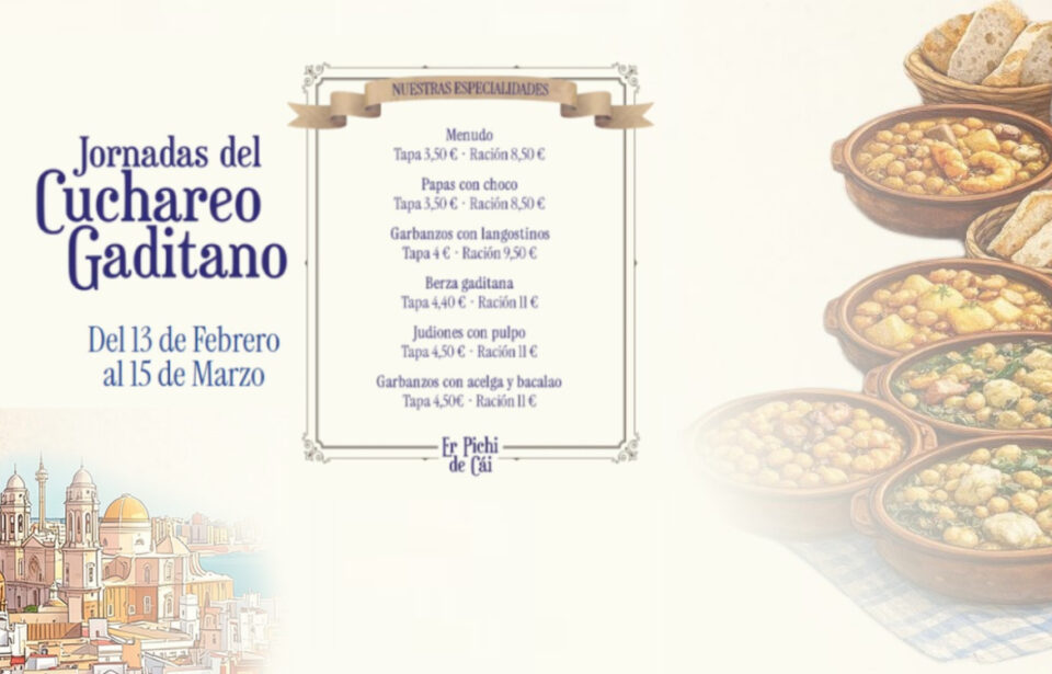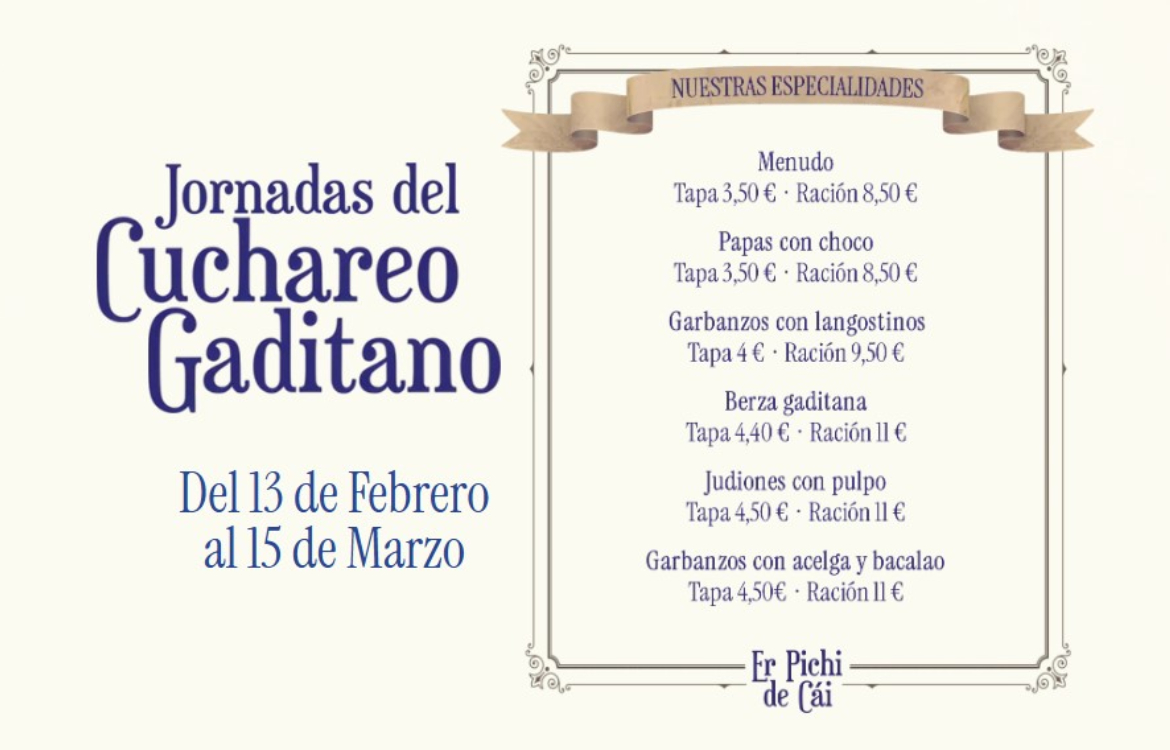 Er Pichi de Cái celebra sus Jornadas del Cuchareo Gaditano en todas sus tabernas de la provincia de Málaga. La iniciativa, dedicada a los guisos más arraigados del recetario de Cádiz, se desarrollará entre el 13 de febrero y el 15 de marzo, coincidiendo con dos fechas señaladas para la marca: la final del COAC de Cádiz y la despedida del Carnaval de Málaga, festival al que Er Pichi de Cái acompaña año tras año como mecenas y patrocinador.