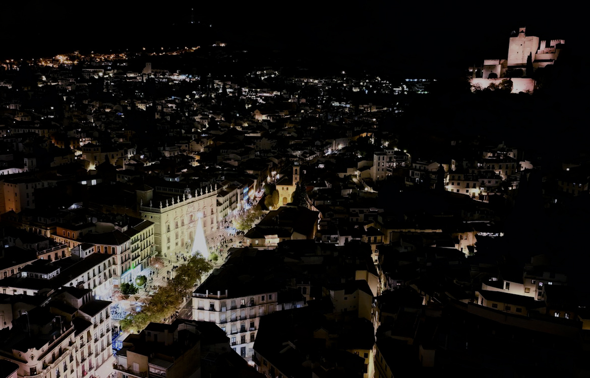 El centro de Granada se ha llenado de gente para disfrutar del alumbrado navideño en el inicio del puente de la Constitución y la Inmaculada y el dron de la Policía Local ha captado unas imágenes aéreas espectaculares, que el cuerpo policial ha compartido en su cuenta oficial en redes sociales.