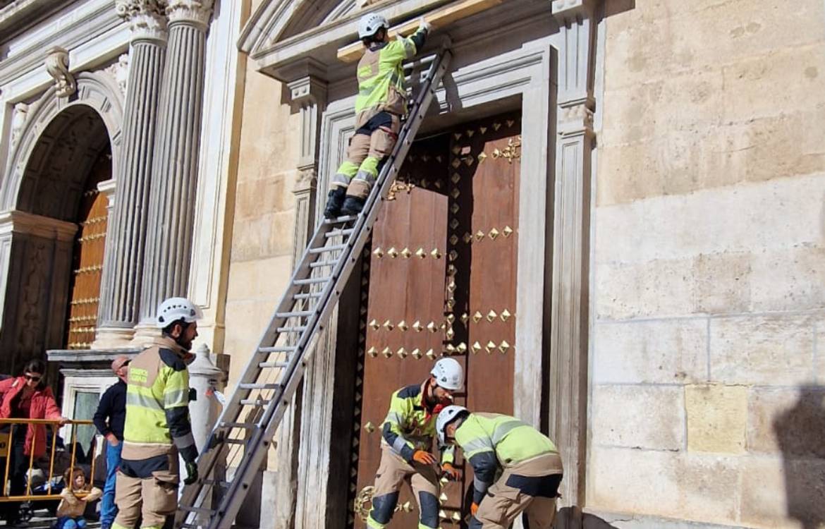 El Ayuntamiento de Granada ha realizado este domingo un simulacro de actuación de emergencia, evacuación y salvaguarda del patrimonio artístico y cultural en la fachada del Palacio de la Real Chancillería, en la Plaza de Santa Ana, en el que han participado el Servicio de Bomberos y el Grupo de Rescate en Entornos Patrimoniales (Greps).