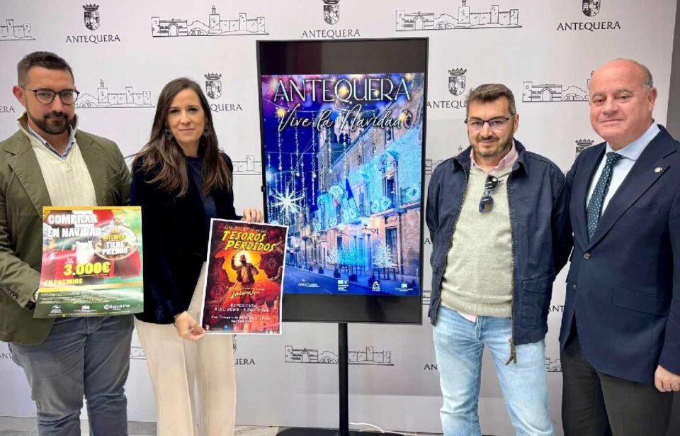 El alcalde de Antequera, Manolo Barón, acompañado por la responsable de Comercio y Turismo, Ana Cebrián, y el presidente de ACIA, Jorge del Pino, ha dado a conocer la campaña comercial y cultural de Navidad 2025. En la presentación también ha participado el fotógrafo antequerano Nono García, autor del cartel oficial que anunciará estas fiestas.
