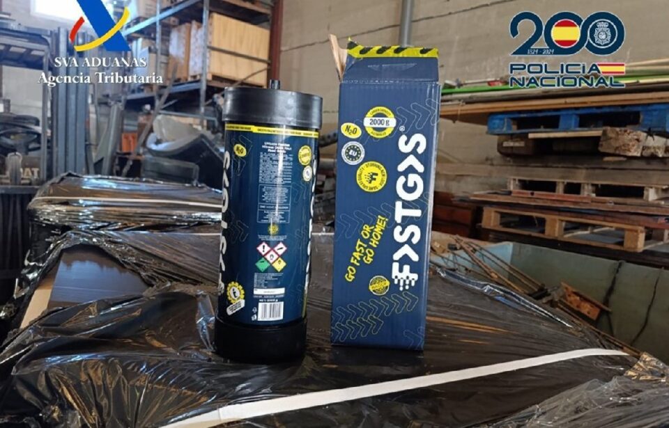 En el registro de su domicilio y una nave industrial se hallaron 2.592 botellas de óxido nitroso, conocido popularmente como ‘gas de la risa’, que sumaban 5.184 litros. Durante la operación, además, se han intervenido 2.100 euros en efectivo y 40.000 euros en billetes falsos.