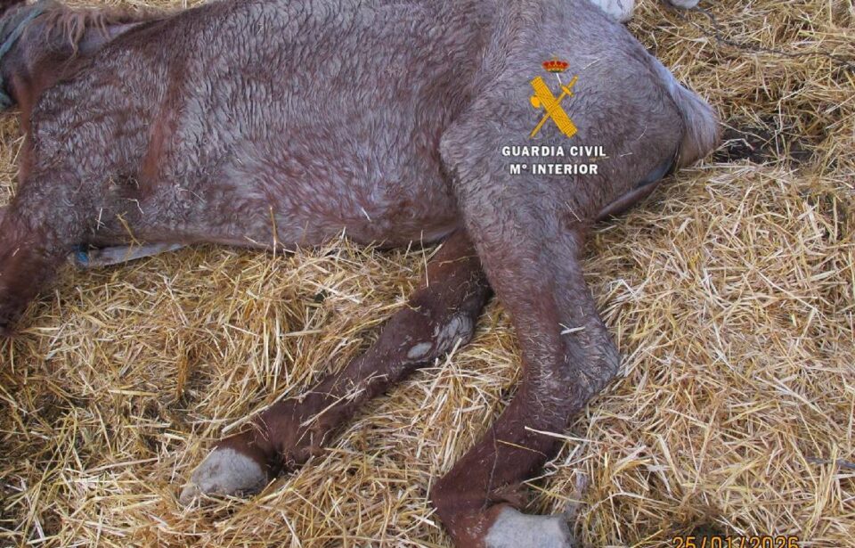 Al personarse en el lugar, los guardias civiles comprobaron que el animal se encontraba permanentemente en posición de decúbito lateral con imposibilidad de levantarse por sus propios medios. Además, tras su inspección se determinó que el animal sufría una deformación extrema de una de sus pezuñas y debido al daño fue necesario practicarle la eutanasia.