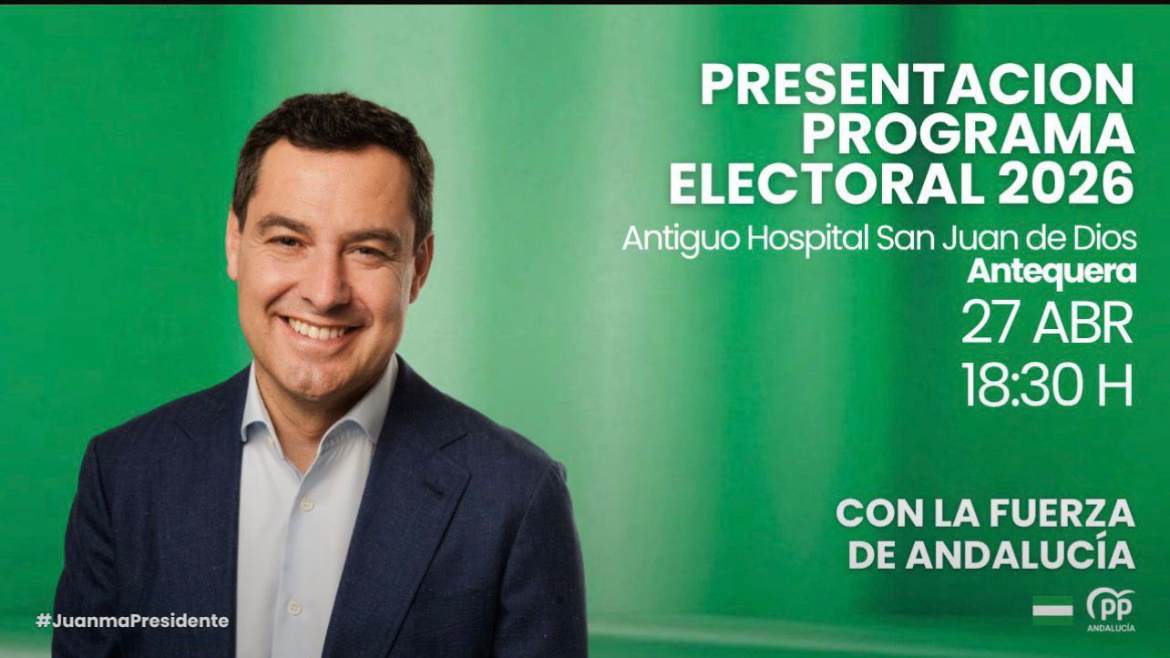 El presidente de la Junta de Andalucía y candidato del Partido Popular, Juanma Moreno, ha elegido Antequera como escenario para la presentación de su programa electoral. El acto tendrá lugar este lunes en el San Juan de Dios, desde las 19.00 horas, convirtiéndose en una de las citas más relevantes de la campaña.