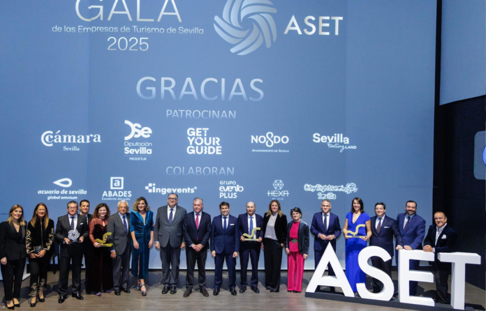 La Asociación Sevillana de Empresas Turísticas (ASET) celebró su Gala del Turismo, un acontecimiento que reunió a representantes de las administraciones, así como a los 130 asociados de ASET, un número en constante crecimiento que refleja la fortaleza y vitalidad del sector turístico sevillano, que terminará el año con más de 8 millones de turistas.
