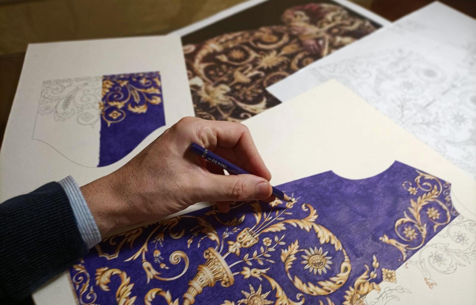 El criterio aplicado ha sido unificar las cenefas con roleos en disposición de continuidad que rematan la parte inferior de la túnica, el cuello y las mangas. No teniendo documentación fotográfica de la trasera de la túnica, se ha decidido repetir el mismo diseño que la delantera, salvo en la parte superior, donde los roleos que conforman el contorno de la botonadura, se adaptan a la caja del cuello.