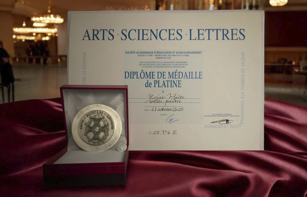 Con una alegría desbordante y aún sin terminar de creérselo, la pintora malagueña Maite Rojas vive estos días en una nube tras recibir el pasado sábado en la capital francesa la Medalla de Platino de la Academia de Artes, Ciencias y Letras de París, la más alta distinción que otorga la entidad, y que tiene como objetivo reconocer y promover a mujeres y hombres que, a través de su talento y trabajo, participan en la influencia de la cultura en los ámbitos artístico, literario y científico.