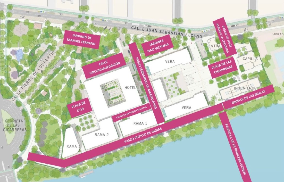 Entre las denominaciones previstas figuran Paseo Puerto de Indias, Jardines Nao Victoria, Muelle de las Mulas, Paseo Fernando de Magallanes, Plaza de las Cigarreras, Pasaje de Jesús Atado a la Columna, calle Circunnavegación, Cronista Antonio Pigafetta y Plaza de 1519. A estos se suman los Jardines de Manuel Ferrand, que recuperarán su configuración original ocupando todo el espacio verde comprendido entre la avenida Juan Sebastián Elcano y la Glorieta de las Cigarreras.