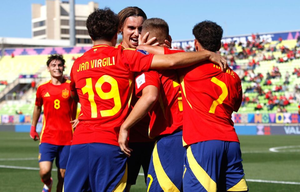 En el 24, España sacó un córner en corto y Rodrigo Mendoza, en la frontal, recibió el esférico antes de enviar un precioso pase picado para el delantero sevillano, que controló a la perfección y le pegó con el empeine para adelantar a los suyos. Iker Bravo y Virgili cocinaron el segundo antes del descanso, pero la jugada acabó con un defensa rival saliendo al corte.
