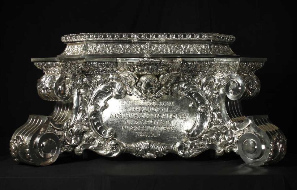 Por su parte, el cuerpo superior adopta forma de plataforma destinada a acoger la imagen, con una ornamentación contenida basada en una cenefa de rocalla ejecutada mediante repujado, lo que aporta equilibrio dentro de un lenguaje estilístico de carácter historicista.