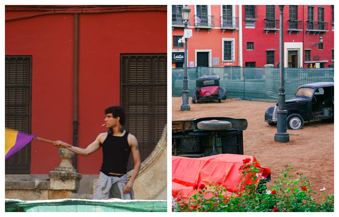 Coches de época y banderas republicanas forman parte del atrezo que se ha colocado en la plaza de Santa Ana para convertirla en un escenario de época de la España de los años 30. Con la participación de más de 200 figurantes, han rodado escenas sobre un estallido revolucionario durante la Segunda República.