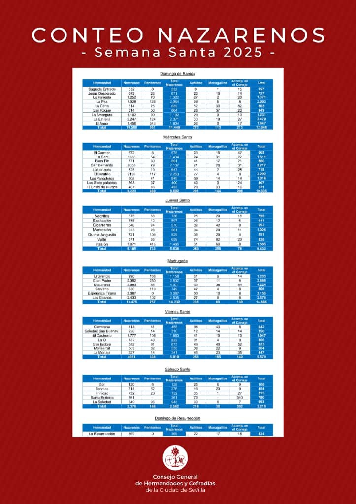 El Consejo de Hermandades y Cofradías de Sevilla ha dado a conocer el conteo de nazarenos de la Semana de 2025. En el informe destaca que las cofradías con más componentes en la calle fueron la Macarena, con 4.442 integrantes, y la Esperanza de Triana, con un cortejo compuesto en su totalidad con 3.135 personas. Entre ambas suman más de la mitad de toda la Madrugá.