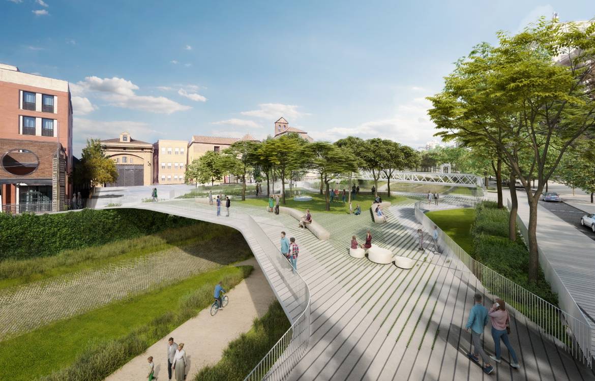 Sobre el cauce, se proyecta un parque lineal de 1.400 metros de longitud en el que se combinarán zonas de uso para la ciudadanía con un cauce central renaturalizado con vegetación autóctona, césped y acequias. A esta superficie de zonas verdes y de espacio ciudadano se sumarían las que se generarían con la prolongación de los túneles, que ampliarían la regeneración urbana integral del tramo más urbano del Guadalmedina.