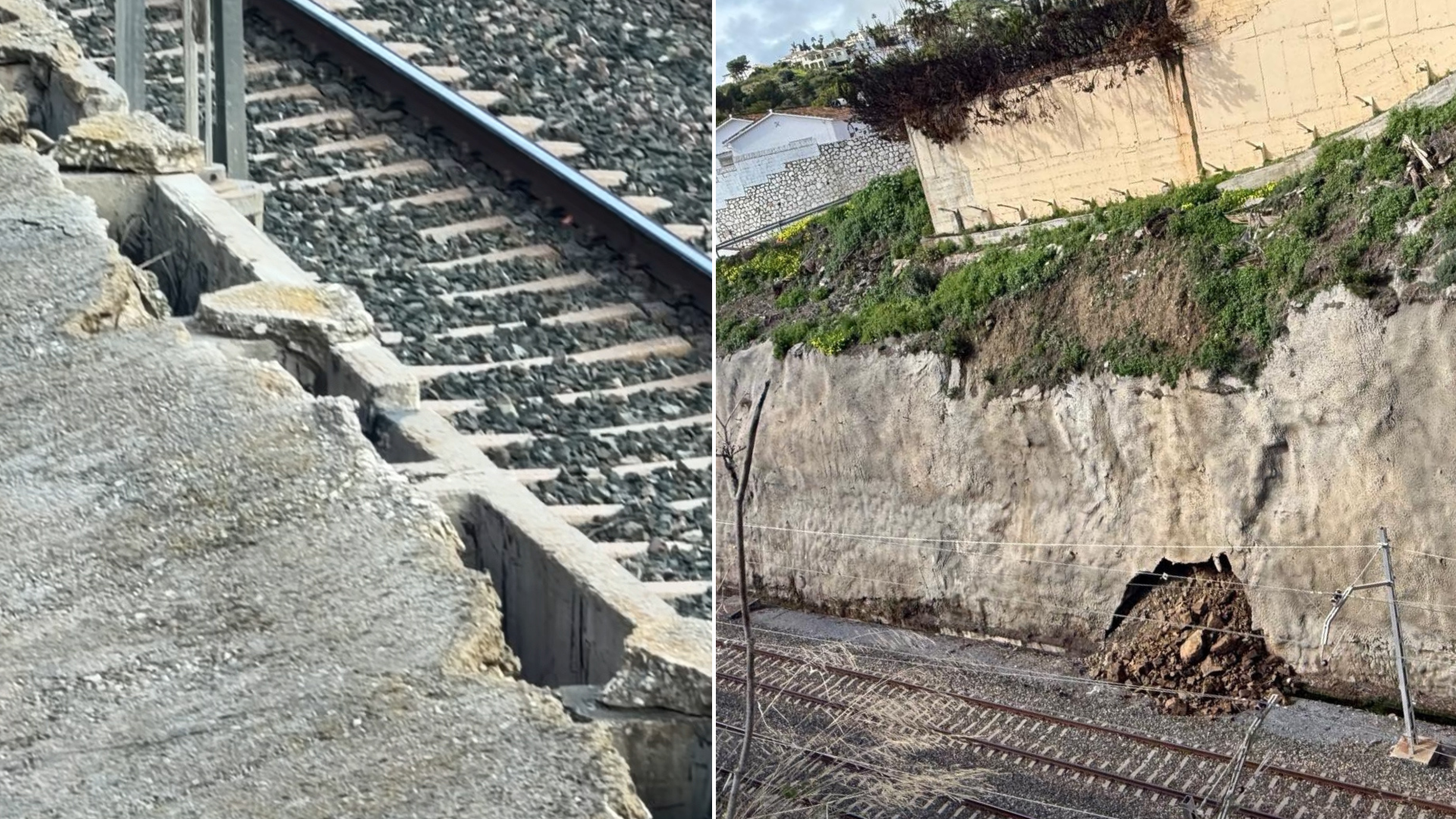 El muro sigue ahí. Agrietado, mordido por el tiempo y por las lluvias, desmoronándose poco a poco junto a la vía del Cercanías en Benalmádena. Un muro que ya ha perdido parte de su cuerpo y que, aun así, continúa sosteniendo una vivienda en la parte superior y conviviendo a escasos metros del paso diario de los trenes. Para los vecinos, es una amenaza visible. Para Adif, no lo es.
