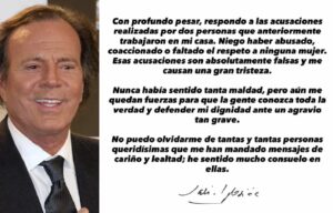 Julio Iglesias responde por primera vez a las acusaciones contra él: «Niego haber abusado, coaccionado o faltado el respeto a ninguna mujer», señala en su defensa el cantante que esta madrugada colgaba a través de sus canales oficiales este primer comunicado tras tres días en el que se ha convertido … Sigue leyendo Primer comunicado de Julio Iglesias: «Niego haber abusado o faltado el respeto a ninguna mujer»