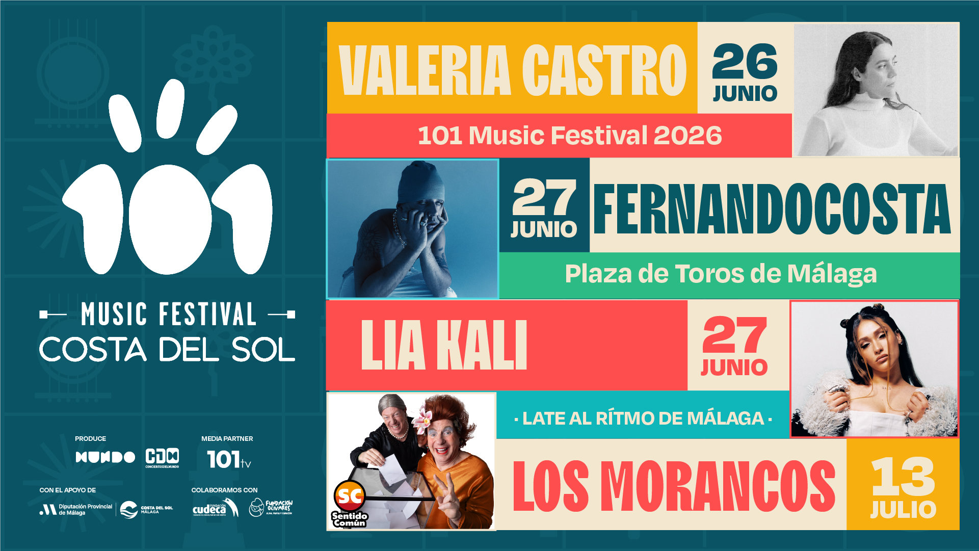 El 101 Music Festival Costa del Sol apunta ya a 2026 con cuatro primeras confirmaciones que marcan las señas de identidad de su sexta edición: Valeria Castro, Fernando Costa, Lia Kali y Los Morancos serán algunos de los protagonistas de un cartel que volverá a convertir la Plaza de Toros de Málaga en el epicentro musical del verano andaluz.