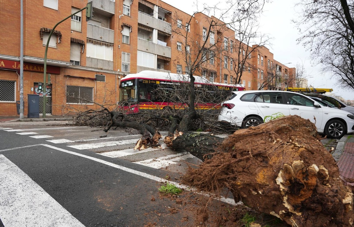 A primera hora de la mañana, un árbol cayó sobre un tren de Cercanías entre Dos Hermanas y Utrera, afectando a un centenar de pasajeros. Todos fueron evacuados mediante pasarelas a otro convoy situado en paralelo. Aunque no se registraron heridos, el incidente generó retrasos y cancelaciones tanto en la línea C1 de Cercanías como en los servicios de media distancia con destino Cádiz y Málaga, operando únicamente una vía en varios tramos.