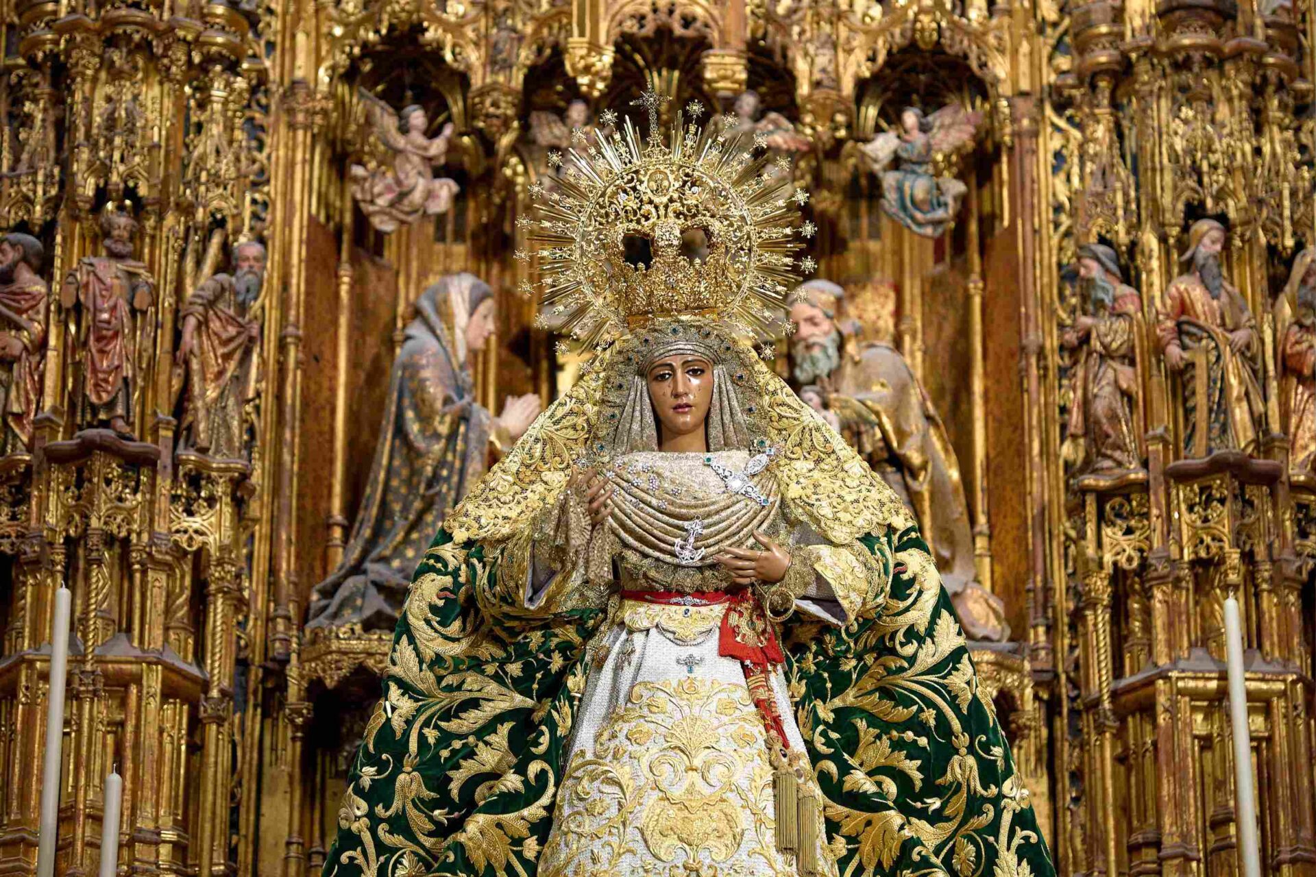 La Esperanza de Triana ha estado expuesta en el trascoro de la Catedral desde el domingo hasta el martes. Desde el miércoles hasta el viernes celebra el tercer triduo extraordinario del mes en el altar mayor de la SEO hispalense. Por último, el sábado a las 11.00h el arzobispo de Sevilla, monseñor Saiz Meneses, oficiará la función del dogma en el altar mayor de la Catedral de Sevilla.