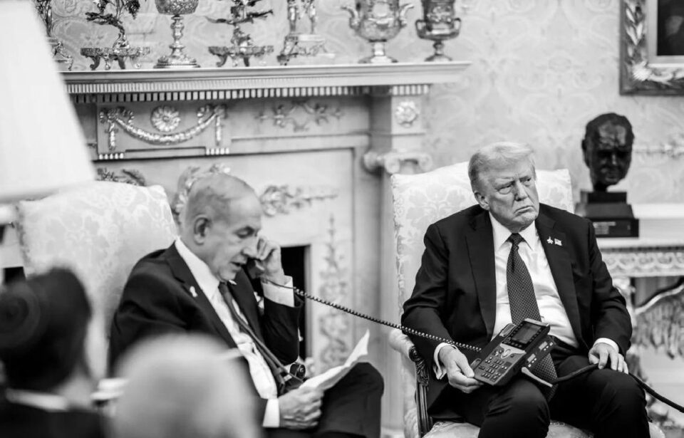 El poder en una foto: cuando Trump obligó a Netanyahu a pedir perdón por teléfono. En la imagen se ve a Netanyahu llamando para disculparse ante el jeque catarí para disculparse por el bombardeo de Doha. La foto, en blanco y negro, ha sido distribuida por la Casa Blanca para archivar este momento crucial de la reunión.