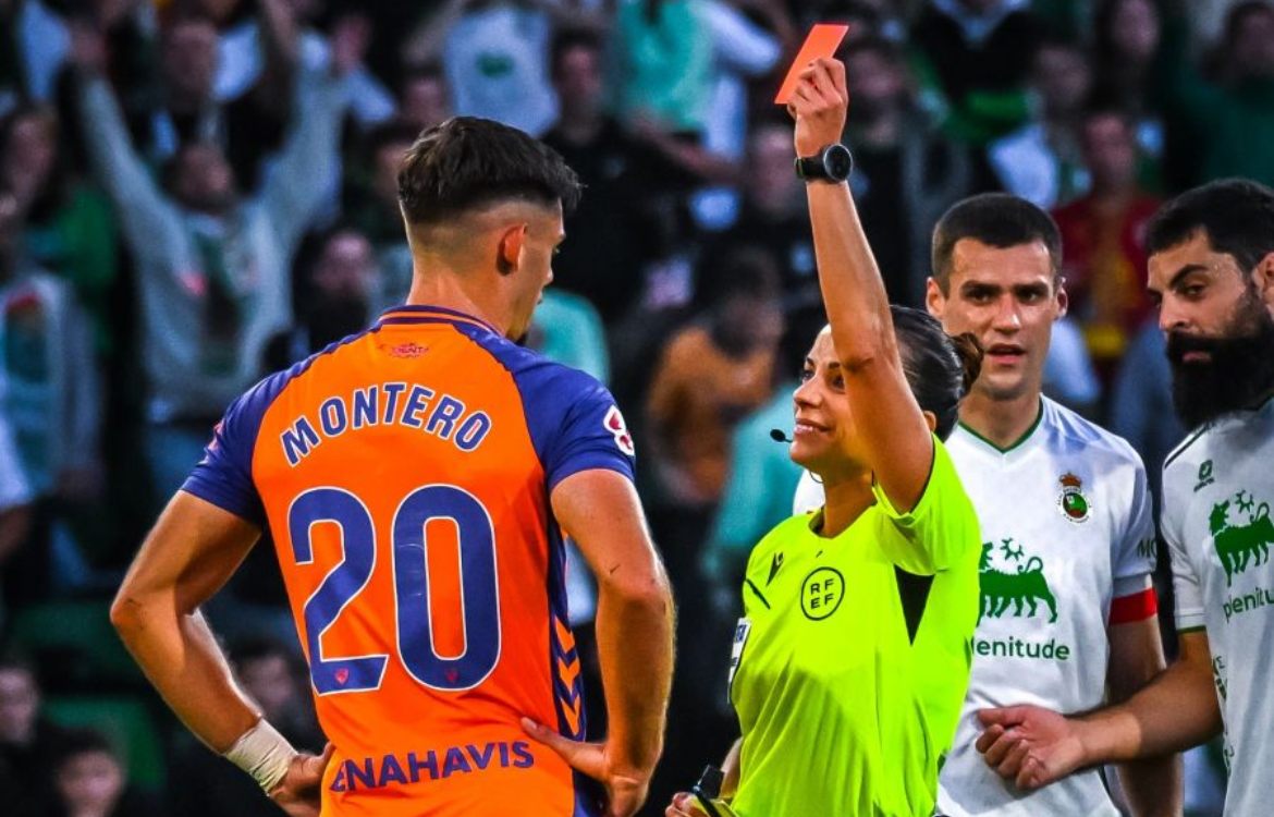 Fue el central del Málaga, Javi Montero, quien vio la cartulina roja al borde del final del primer tiempo. En una acción sin aparente peligro, en el centro del campo, dio una patada a destiempo a Andrés Martín, tocando sus tacos con el tobillo del rival. La colegiala le enseñó la cartulina amarilla, pero fue avisada por la sala VAR para rectificar su decisión y expulsar así al exracinguista al borde del descanso. Con el videoarbitraje, las imágenes dejaban pocas dudas: expulsión clara ante la peligrosidad de la entrada.