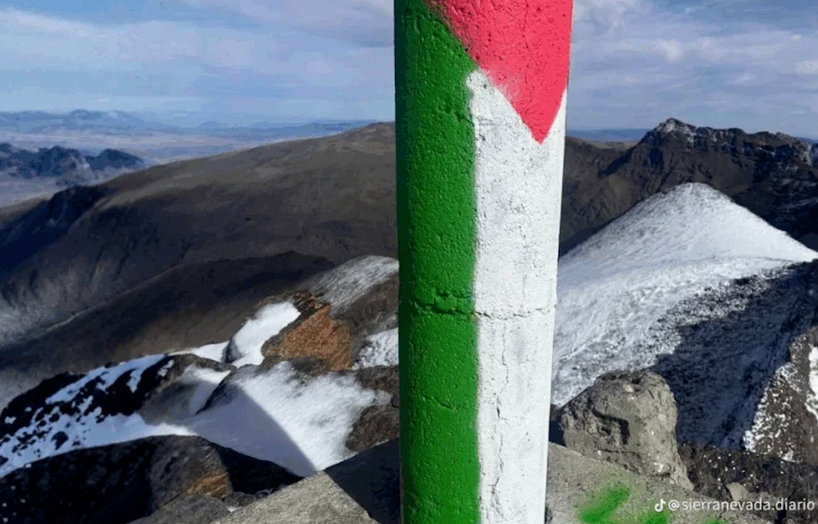 El vértice geodésico situado en la cima del pico Veleta, uno de los puntos más altos de la Península Ibérica, amaneció cubierto con los colores de la bandera de Palestina. En la base de hormigón que sostiene este hito geográfico, también se ha podido leer la palabra “Libre”, escrita en pintura verde.